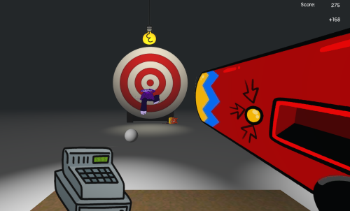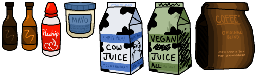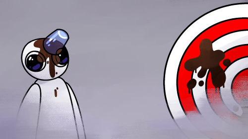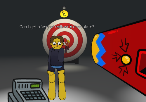 You open your eyes to an unusual foggy void, with seemingly no one in sight. You give yourself a moment to look at your surroundings; there's a comically large target straight ahead, along with a bright red canon beside you. Your first customer approaches, they seem... kind enough... requesting a Vegan Milk with Chocolate? What are they talking about? You turn around to see a table full of ingredients. It's your job to make these customers unusual drinks, but try not to mess up as test.png won't be happy...
