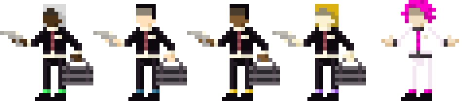 - Two enemy types; the weaker black suited people and the stronger white suited person (me!)