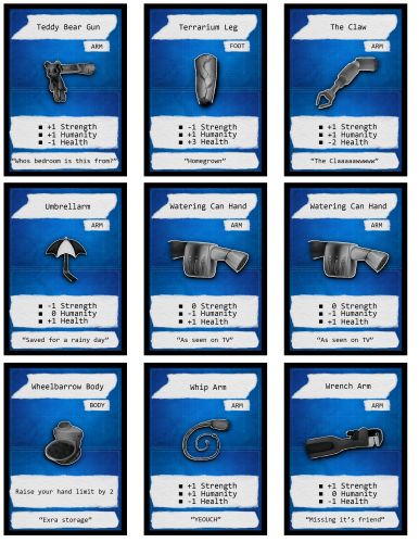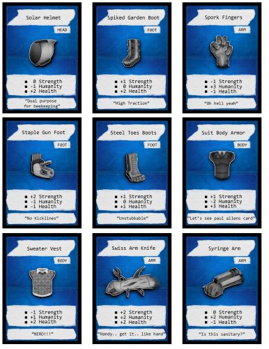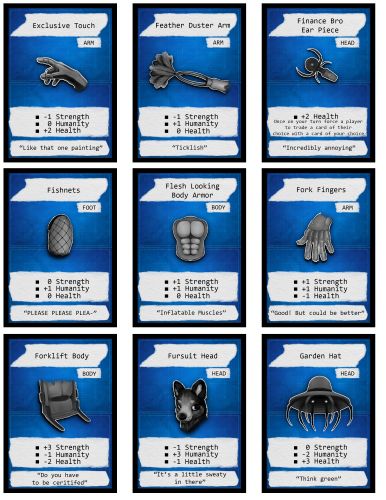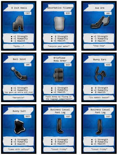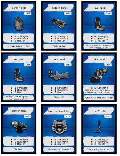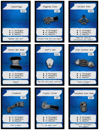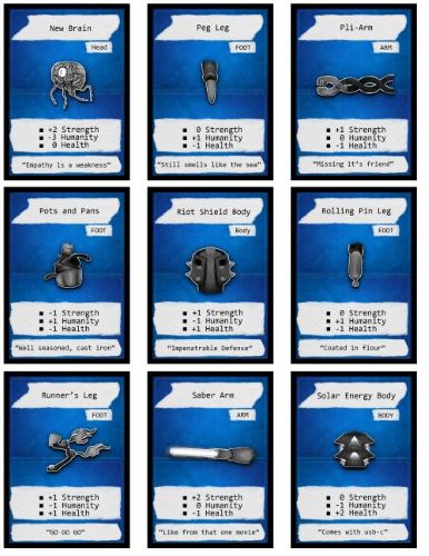 While balancing their three core stats (strength, health, and humanity) players will build up their arsenal by choosing a district to explore each turn. When you explore a district you will pull from a deck which will be filled with parts, events, and power-ups that are themed around the district you’re exploring.